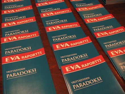 Julkistamistilaisuudet Tapahtumat 16.11.2005 Julkistamistilaisuus Karl-Erik Michelsenin EVA RAPORTTI ”Yrittäjyyden paradoksi” julkistettiin Pörssiklubilla 16.11.2005. 16.11.2005 Julkistamistilaisuudet Tapahtumat Jaa Tulosta