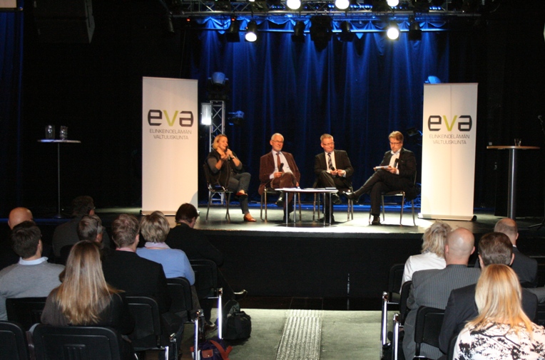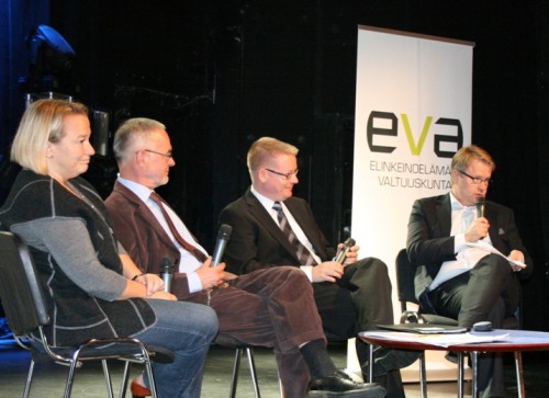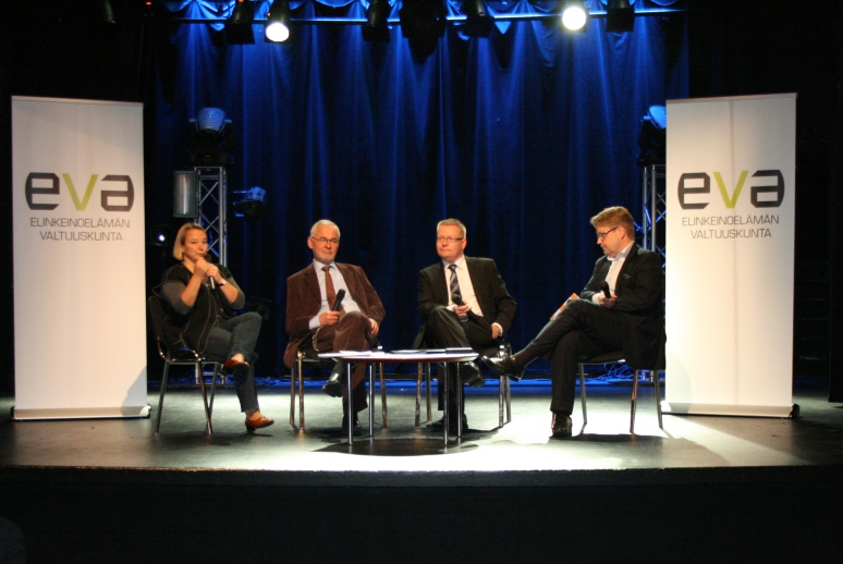 Raportin julkaisutilaisuuden keskusteluun Gloria-salissa osallistuivat Matti Apusen johdolla kansanedustaja Tuija Brax, professori Urpo Kangas ja toimitusjohtaja Timo Jaatinen.
