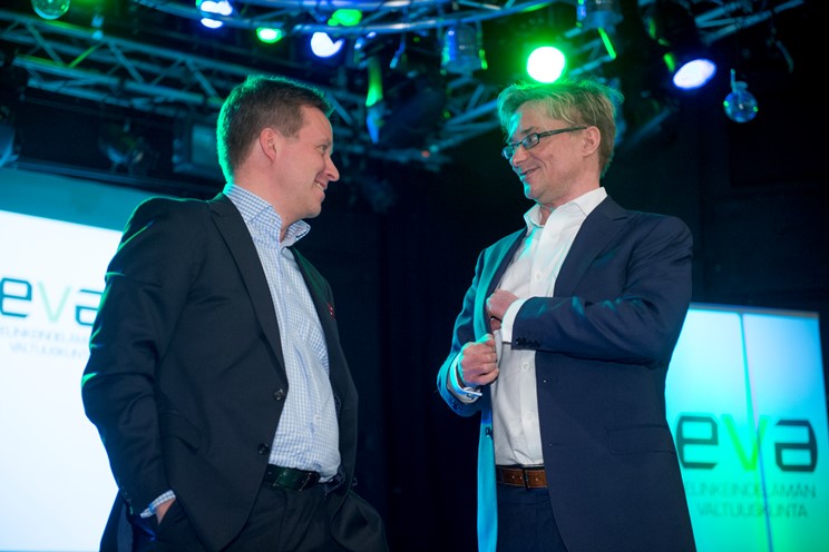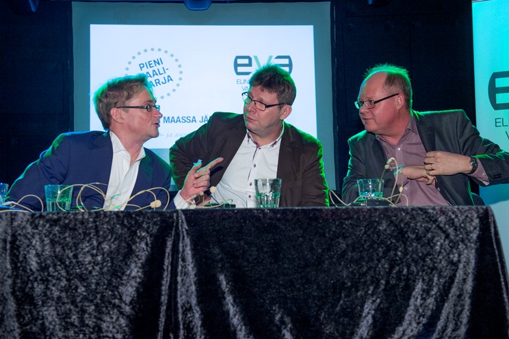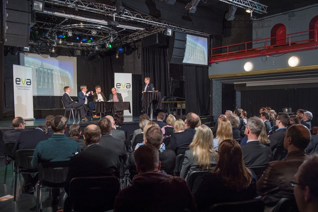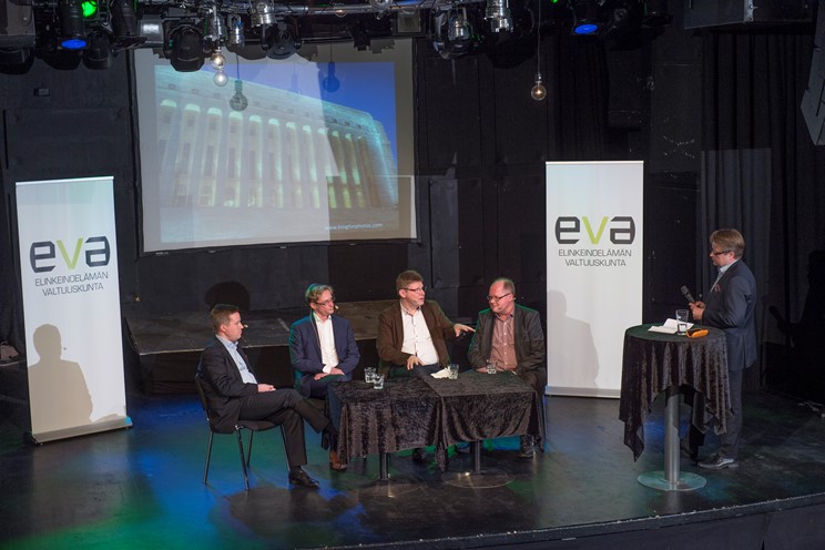 EVAn tilaisuudessa 4.3. olivat Matti Apusen johdolla keskustelemassa Miltton Networksin toimitusjohtaja Jussi Kekkonen (vas.), Kreabin toimitusjohtaja (1.4. alk.) Mikael Jungner, Talouselämän päätoimittaja Reijo Ruokanen ja MTV:n politiikan toimituksen esimies Timo Haapala.