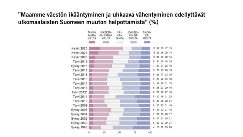 Suomalaiset ovat kääntyneet tukemaan maahanmuuton helpottamista väestöllisistä syistä. Enemmistö (55 %) suomalaisista arvioi, että maamme väestön ikääntyminen ja uhkaava vähentyminen edellyttävät ulkomaalaisten Suomeen muuton helpottamista, ja vain vajaa kolmasosa (30 %) ei pidä väestövajetta aiheellisena syynä helpottaa maahanmuuttoa (Kuvio 1).