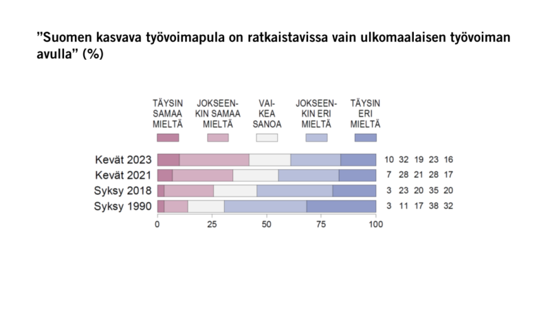 Keskimäärin varsin epäilevästi maahanmuuttoon suhtautuvat suomalaiset ovat siis muuttaneet kantojaan paljon suopeammiksi työperäiselle maahanmuutolle ja toivovat tulevalta hallitukselta aktiivisuutta asiassa. Tämän kevään EVAn Arvo- ja asennetutkimuksen hallitusohjelmakyselyssä suomalaisten enemmistö (54 %) toivoi työperäisen maahanmuuton lisäämisen painottuvan tulevan hallituksen ohjelmassa viime vuosia enemmän.