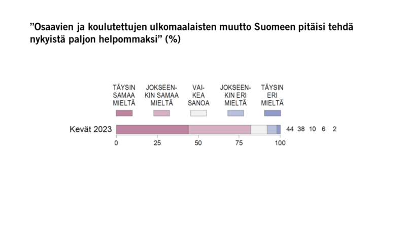Selvimmin suomalaisten lämpeneminen työperäiselle maahanmuutolle näkyy suhtautumisessa ulkomaalaisiin osaajiin, joiden maahanmuuton helpottamisesta vallitsee likimain konsensus. Hyvin suuri enemmistö (82 %) katsoo, että osaavien ja koulutettujen ulkomaalaisten muutto Suomeen pitäisi tehdä nykyistä paljon helpommaksi, ja alle kymmenesosa (8 %) on eri mieltä osaajien maahanmuuton helpottamisesta (Kuvio 3).