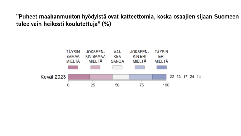 Suomalaisten mielestä emme oikein ole sitä vieläkään, ainakaan korkeasti koulutetulle työvoimalle. Vaikka suomalaiset toivovat lisää työperäistä maahanmuuttoa, varsin moni (45 %) katsoo, että puheet maahanmuuton hyödyistä ovat katteettomia, koska osaajien sijaan Suomeen tulee vain heikosti koulutettuja. Jonkin verran pienempi osuus (38 %) torjuu käsityksen (Kuvio 5).