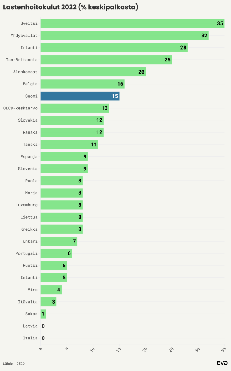 Lastenhoitokulut muodostavat noin kolmasosan työntekijän keskipalkasta Sveitsissä ja Yhdysvalloissa. Suomessa lastenhoitokulut ovat OECD-keskiarvoa suuremmat. Useimmissa Euroopan maissa lastenhoitoa subventoidaan, jolloin kustannusten osuus keskipalkasta on monessa maassa pienentynyt yli ajan. Tilastossa on kuvattu sellaisten perheiden lastenhoitokuluja, joiden lapset ovat täysipäiväisessä päivähoidossa. Perheiden maksamista kuluista on vähennetty kaikki julkiset lastenhoidon tuet, subventiot ja mahdolliset verovähennykset. Perheissä toisen vanhemman on oletettu ansaitsevan keskipalkan ja toinen vanhemman tulot oletetaan 67 prosentiksi keskipalkasta. Oletusperheeseen kuuluu kaksi lasta, joista toinen on kahden ja toinen kolmen vuoden ikäinen.