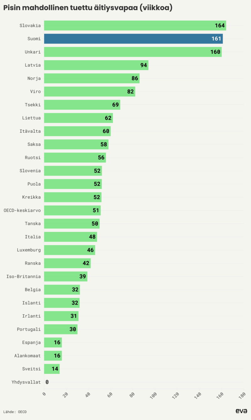 Tässä tilastossa on esitetty viikkoina, kuinka pitkään äiti voi maksimissaan olla tuetulla vapaalla riippumatta tuen suuruudesta. Suomessa pisimmillään 161 viikon vapaan mahdollisuus selittyy sillä, että mukaan lasketaan myös kotihoidontuki. Vastaavia järjestelmiä on myös muualla.