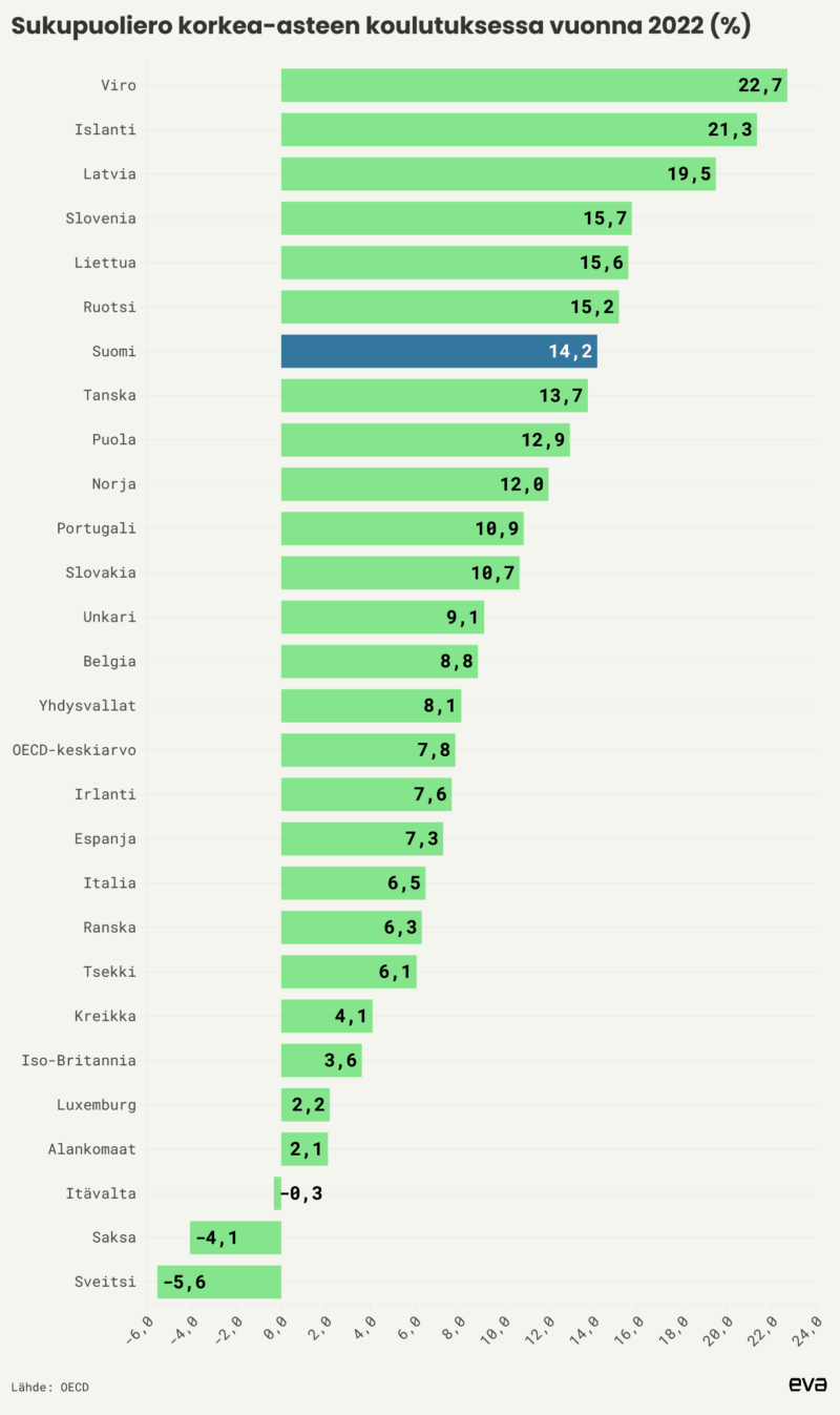Baltian maissa ja Pohjoismaissa naisten osuus korkeakoulutetuista on selvästi suurempi kuin miesten. Suomessa korkeakoulutettujen osuus on naisissa 14,2 prosenttiyksikköä suurempi kuin miehissä. Suomessa sukupuoliero naisten ja miesten korkeakoulutuksen välillä on kahdessa vuodessa pienentynyt noin kaksi prosenttiyksikköä. Kyse voi olla vuosittaisesta heilahtelusta, eikä sen perusteella voi tehdä vielä pidemmälle meneviä tulkintoja.