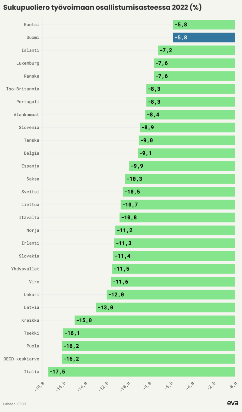 Suomi ja Ruotsi ovat jo pitkään olleet pienimpien sukupuolierojen maita työvoimaan osallistumisasteessa. Molemmissa työvoimaan osallistumisaste on naisilla 5,8 prosenttiyksikköä pienempi kuin miehillä.