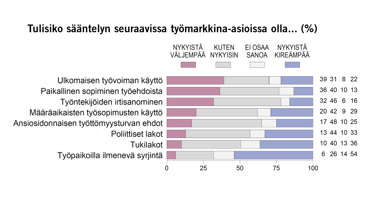 Suhtautuminen hallituksen työmarkkinauudistuksiin jakaantuu voimakkaasti poliittisen kannan mukaan. Esimerkiksi kokoomuksen (72 %) ja perussuomalaisten (52 %) äänestäjien enemmistö kannattaa nykyistä väljempää sääntelyä paikalliseen sopimiseen ja työntekijöiden irtisanomiseen (62 % ja 52 % vastaavasti). SDP:n, vasemmistoliiton ja vihreiden kannat taas kallistuvat hallituksen uudistukset torjuvaan suuntaan.