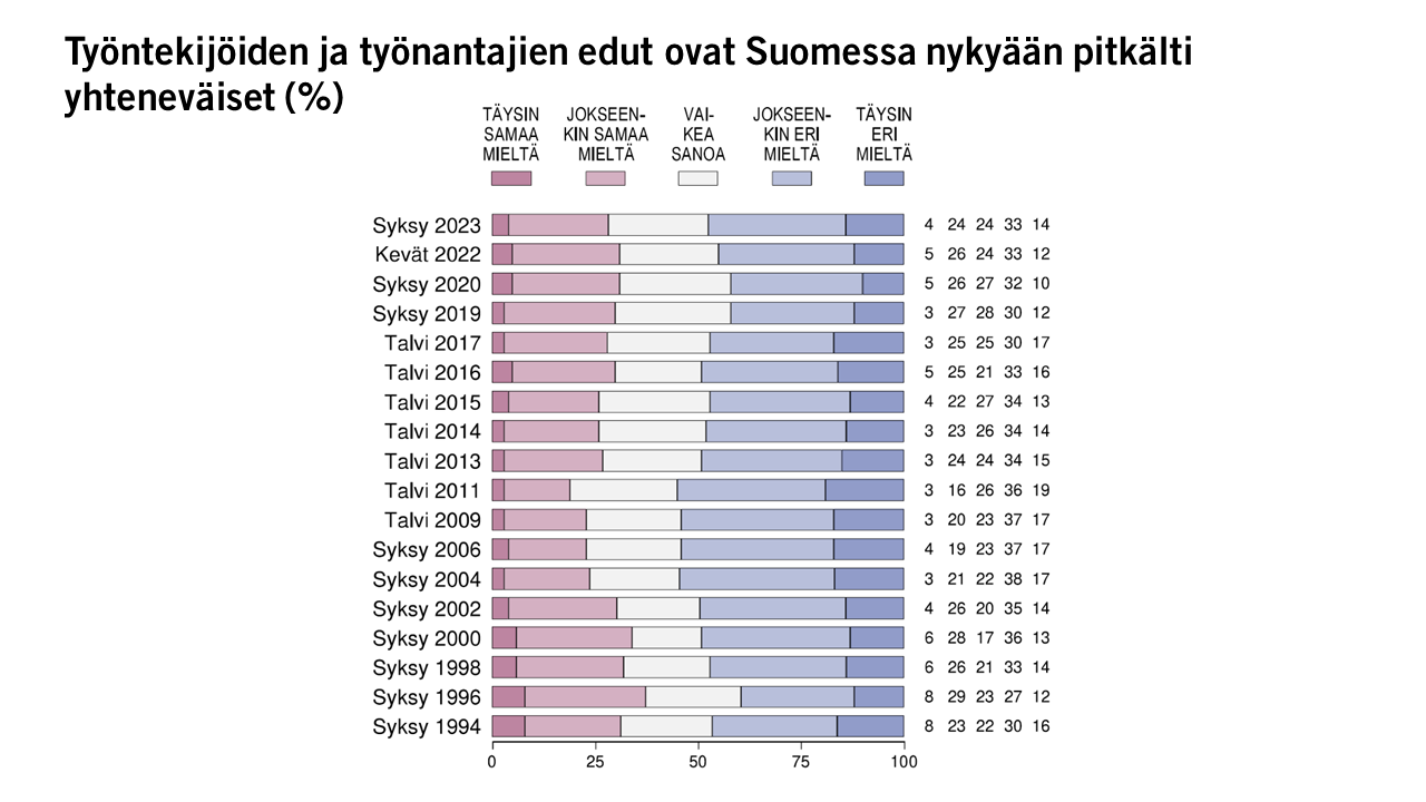 Suomalaisista 28 prosenttia katsoo, että työntekijöiden ja työnantajien edut ovat Suomessa nykyään pitkälti yhteneväiset, 47 prosenttia on toista mieltä.