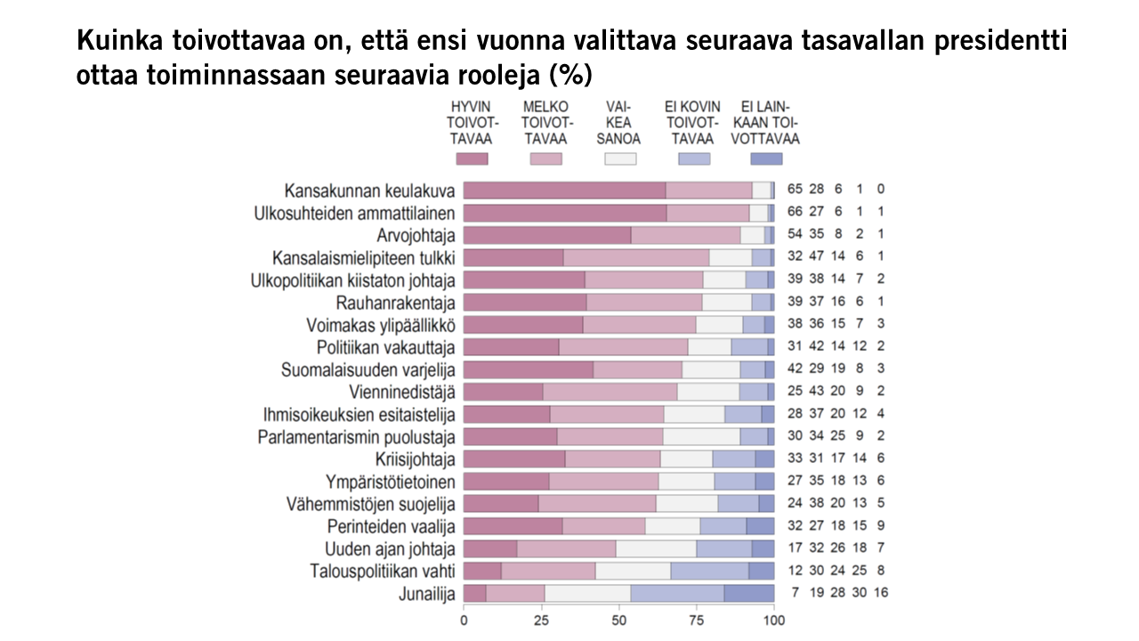 Kuinka toivottavaa on, että ensi vuonna valittava seuraava tasavallan presidentti ottaa toiminnassaan seuraavia rooleja (%) Kuva: EVAn Arvo- ja asennetutkimus