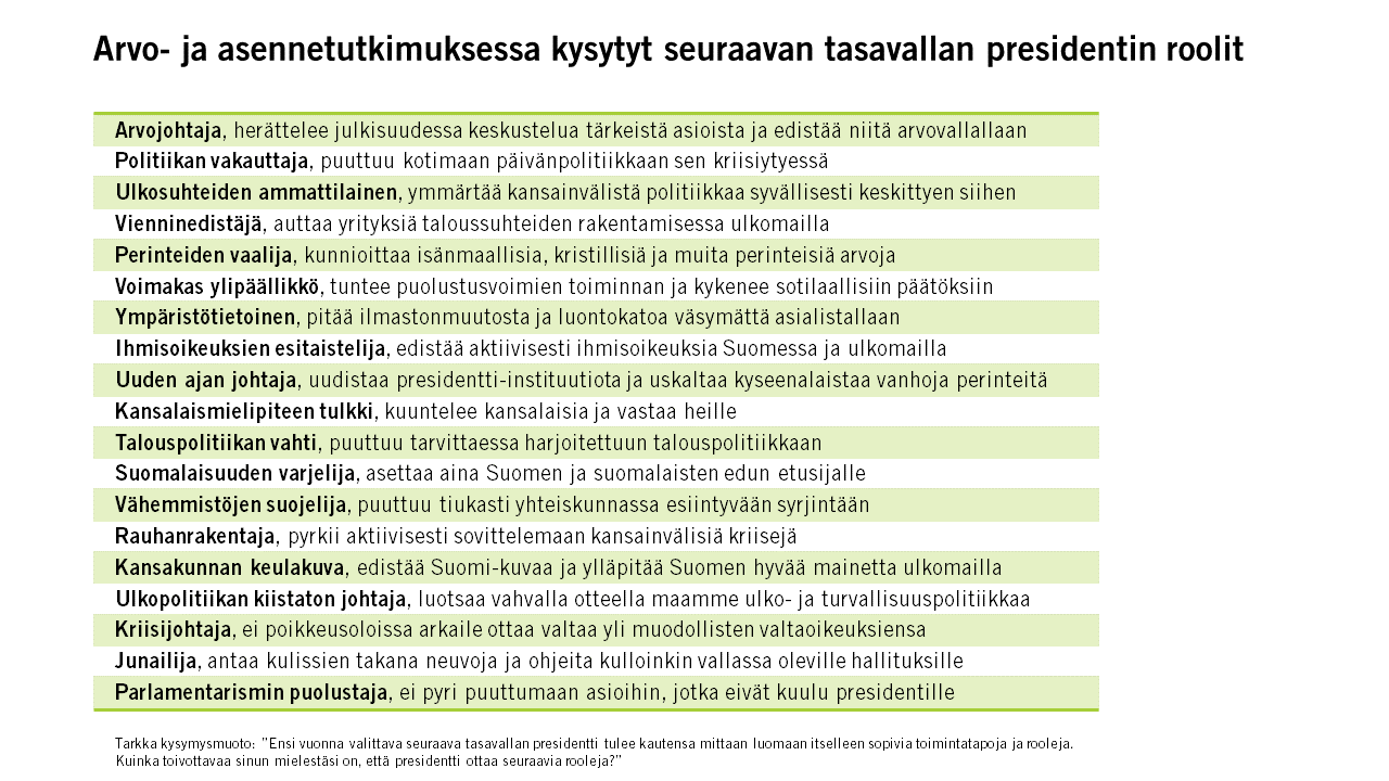 Arvo- ja asennetutkimuksessa kysytyt seuraavan tasavallan presidentin roolit. Taulukko.