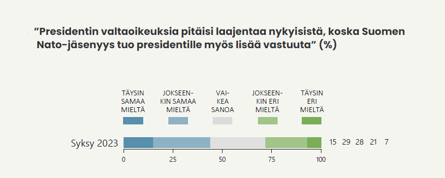 Suomalaiset arvioivat Nato-jäsenyyden edellyttävän presidentin vallan kasvattamista. (Kuvio 3) 44 prosenttia katsoo, että presidentin valtaoikeuksia pitäisi laajentaa nykyisistä, koska Suomen Nato-jäsenyys tuo presidentille myös lisää vastuuta. Liki kolme kymmenestä (28 %) ei pidä Nato-jäsenyyttä asiana, joka edellyttäisi presidentin vallan vahvistamista, ja yhtä moni ei osaa ottaa asiaan kantaa.