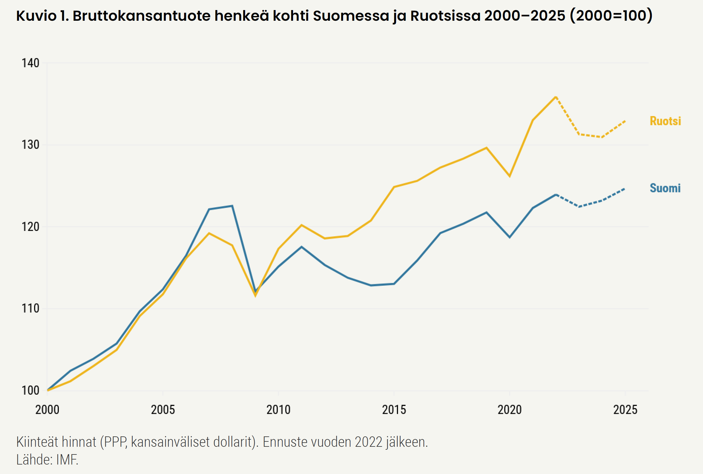 Suomi on elänyt olemattoman kasvun tilassa jo noin 16 vuotta. Henkeä kohti laskettu bruttokansantuote tavoitti finanssikriisiä edeltävän vuoden 2008 tason vaivoin vasta vuonna 2022 (Kuvio 1). [1]