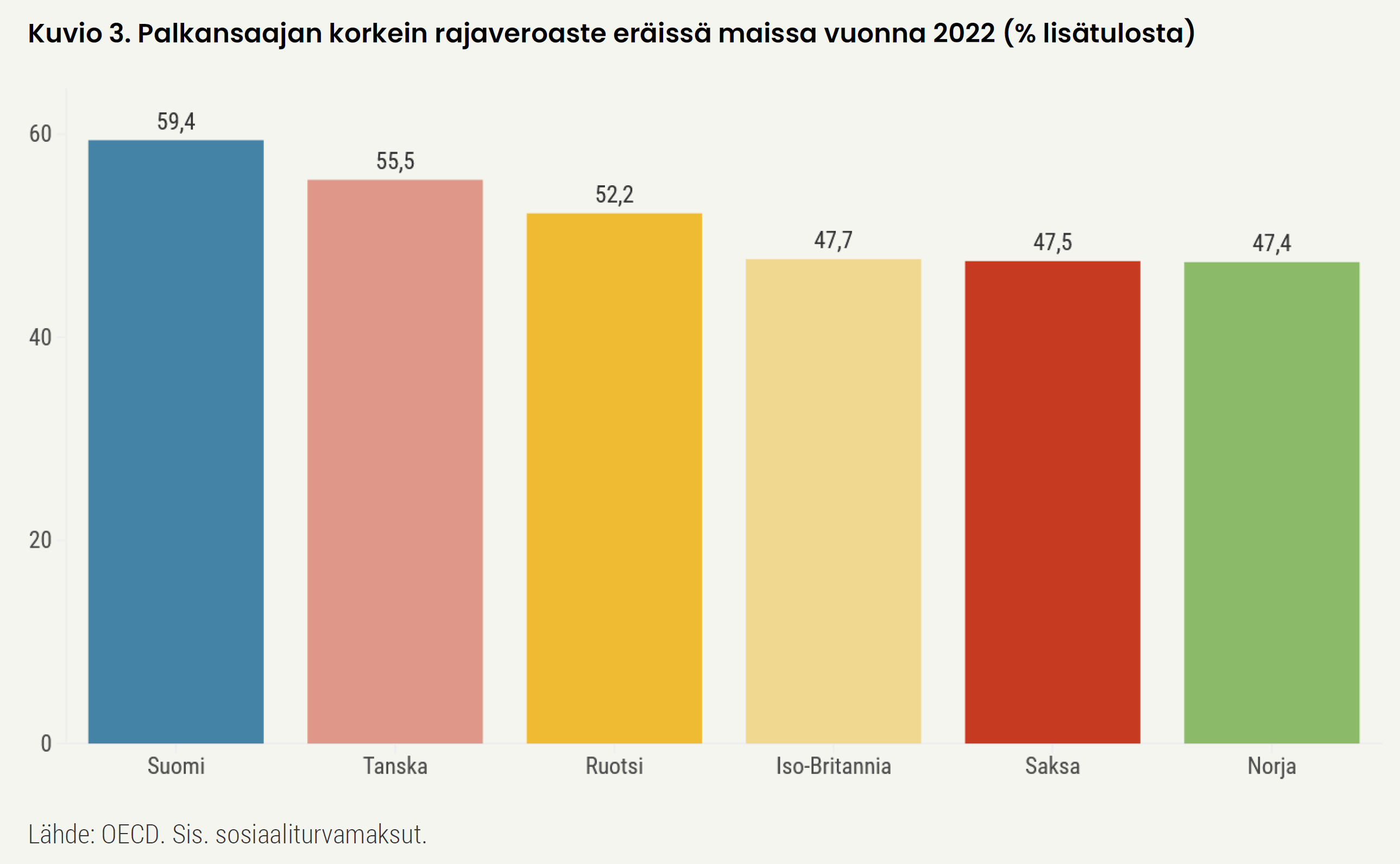 Palkansaajan marginaalivero, eli tienatun lisäeuron verorasitus, on erityisesti suurituloisilla vertailumaita kireämpi (Kuvio 3). Keskituloisellekin palkansaajalle jää käteen vain puolet palkankorotuksesta, ja hyvätuloisen tienaamasta lisäeurosta siirtyy veronsaajille suurin osa. Kireä marginaalivero muodostaa työntekijälle kannustinesteen edetä työuralla eikä kannusta hankkimaan lisätyötä. Uusien vastuiden vastaanottaminen ei ole välttämättä kannattavaa, jos palkankorotuksesta käteen jää vain murto-osa. [7]