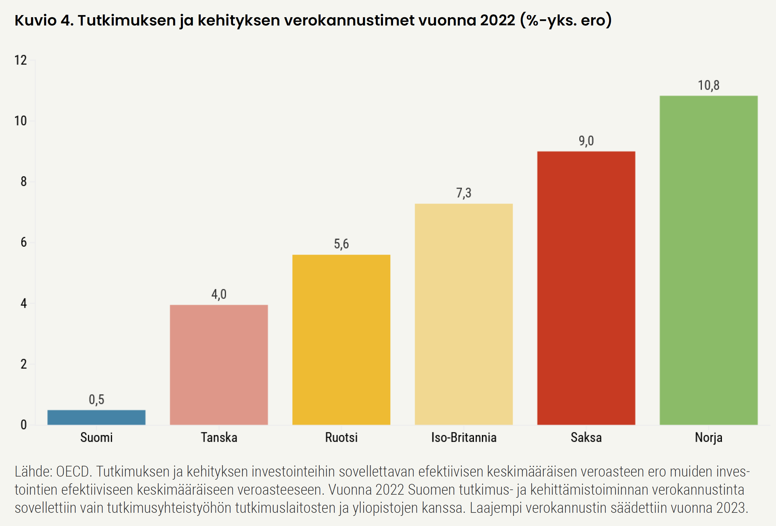 Suomi on soveltanut vuodesta 2021 lähtien määräaikaista tutkimus- ja kehittämistoiminnan verokannustinta yritysten sekä yliopistojen ja tutkimuslaitosten yhteistyöhön, mutta kannustimen käyttö on jäänyt vähäiseksi. Vuonna 2023 säädetyn pysyvän verokannustimen myötä yritykset saavat ylimääräisiä verovähennyksiä tutkimus- ja kehittämistoiminnan menoistaan. Kannustin on kohdennettu lähinnä pienille ja keskisuurille yrityksille, sillä siinä on kansainvälisesti vertaillen matala yläraja.