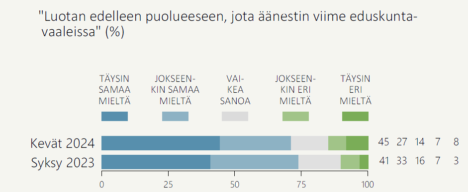 Kevään 2024 aineiston lakkoväittämiä koskevat aikasarjat (ks. Kuviot 4 ja 5 jäljempänä) kertovat, että äänestäjät ovat ryhmittyneet jopa aiempaa enemmän kannattamansa puolueen taakse sen ajamassa politiikassa. Tästä kielii myös se, että ylivoimainen enemmistö (72 %) suomalaisista sanoo luottavansa edelleen puolueeseen, jota äänesti viime eduskuntavaaleissa (Kuvio 3).