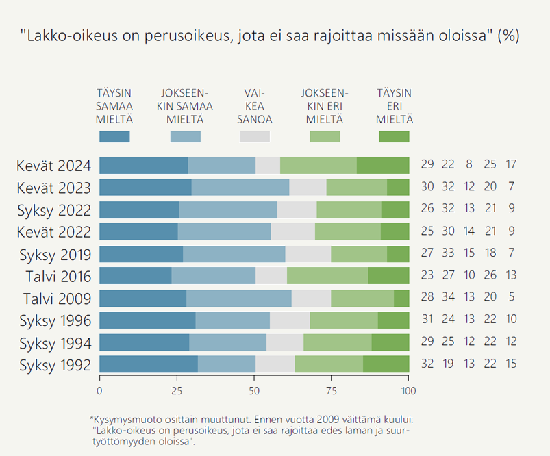 Suurta haittaa aiheuttavien lakkojen kieltämistä kannattavien osuus on kasvanut vuodessa 12 prosenttiyksikköä. Yli 10 prosenttiyksikön muutokset yhden vuoden aikana suomalaisten asenteissa ovat yleensä harvinaisia. Toisaalta vastaavanlainen muutos asenteissa havaittiin vuoden 2016 Arvo- ja asennetutkimuksessa suhteessa edelliseen vuoden 2009 mittaukseen. Tuolloin hieman nykyistä suurempi osuus (48 %) kannatti suurta haittaa aiheuttavien lakkojen kieltämistä. Ennen vuoden 2016 mittausta ammattiyhdistysliike osoitti mieltään ja lakkoili Juha Sipilän (kesk.) hallituksen esittämiä työmarkkinoiden ja sosiaaliturvan uudistuksia vastaan. Niin sanotun kilpailukykysopimuksen solmimisen jälkeen tuki suurta haittaa aiheuttavien lakkojen kieltämiselle kuitenkin hiipui.