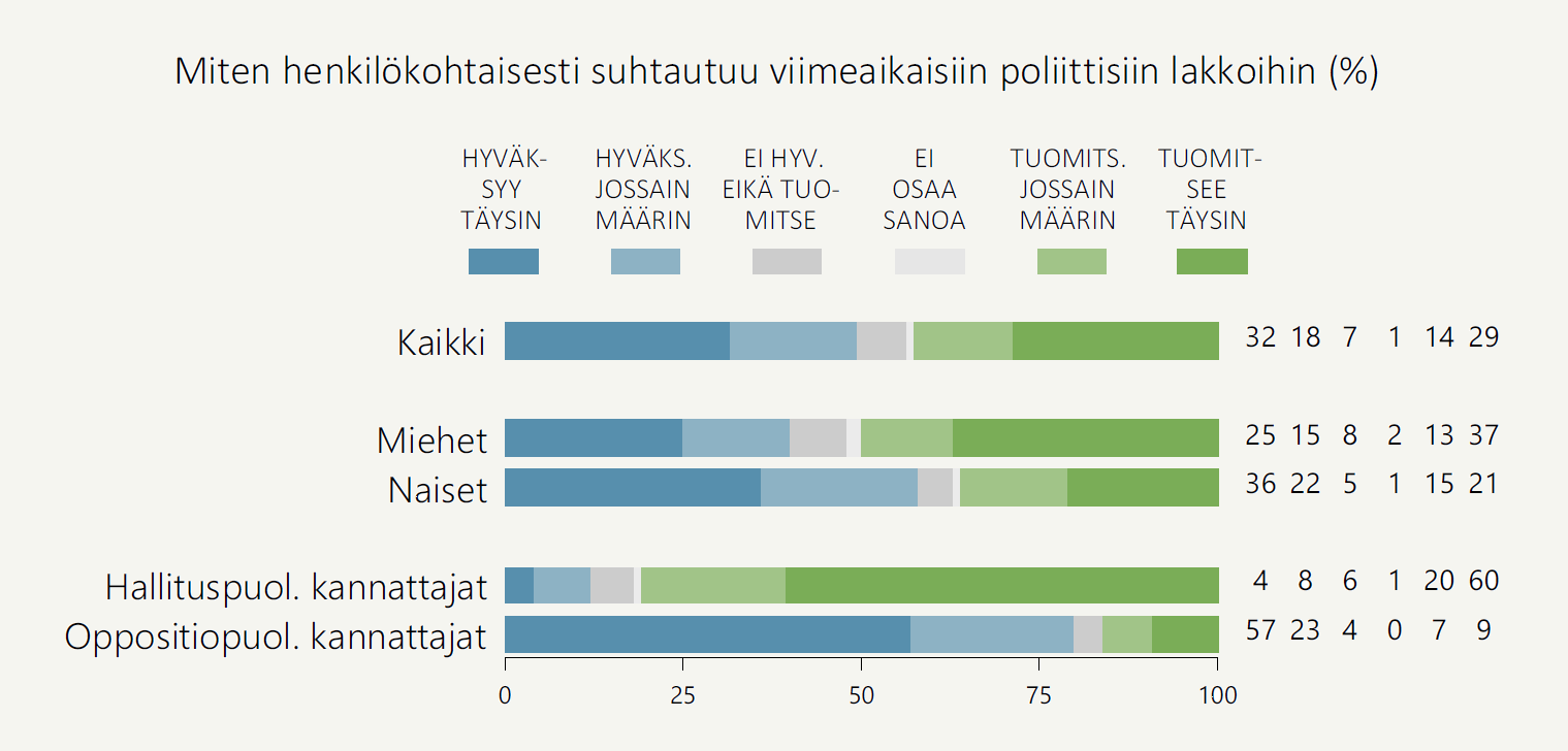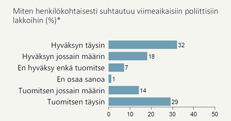 - Puolet (50 %) suomalaisista hyväksyy viime aikojen poliittiset lakot ainakin jossain määrin. 43 prosenttia tuomitsee lakot.
