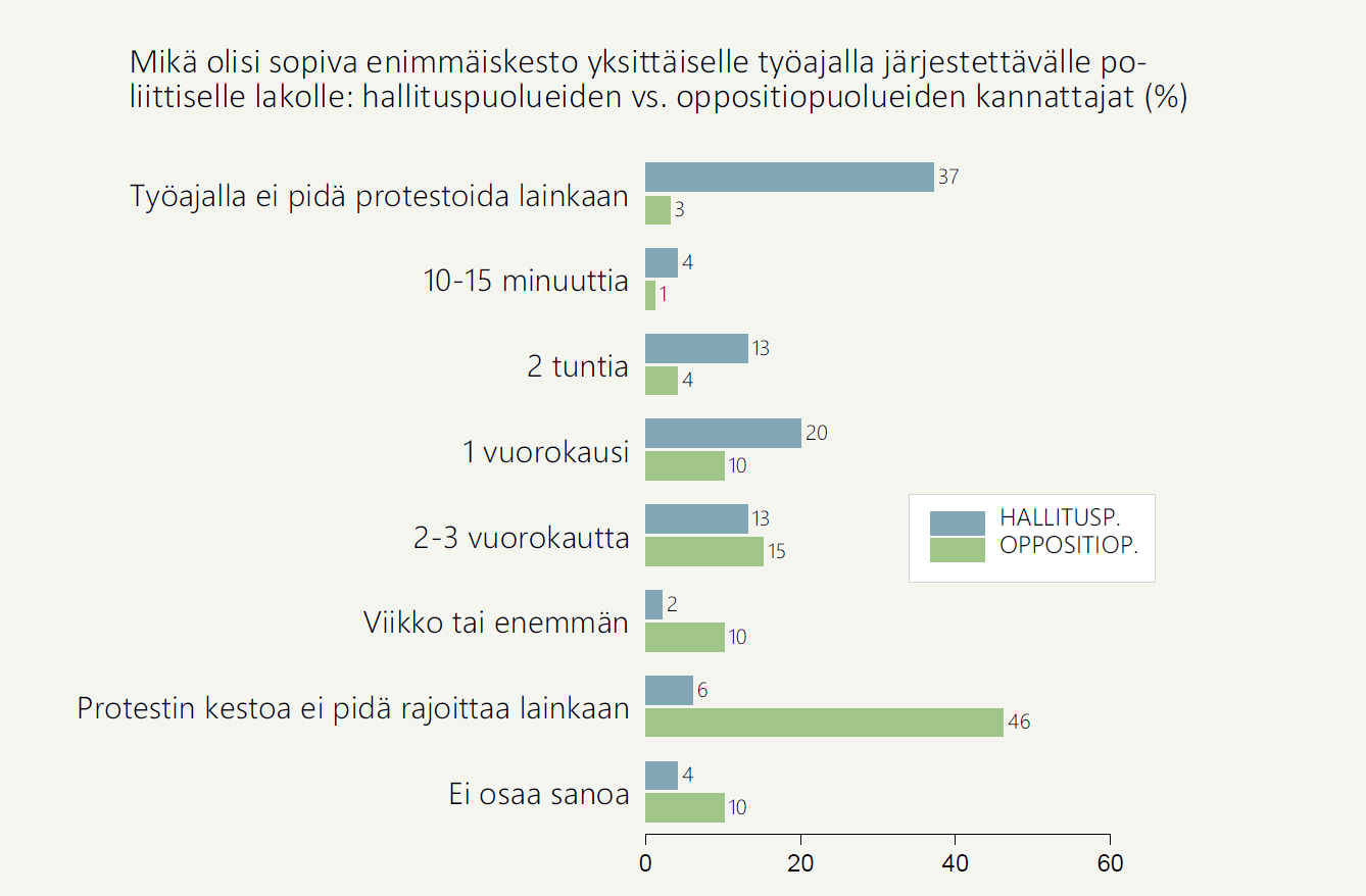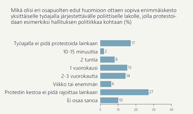 Näin ollen 62 prosenttia suomalaisista on sitä mieltä, että poliittisille lakoille pitäisi asettaa keston suhteen rajat. Enemmistö (56 %) on myös sitä mieltä, että tuon rajan pitäisi olla melko lyhyt, alle kolme vuorokautta. Orpon hallituksen määrittelemälle maksimissaan 24 tunnin pituiselle poliittiselle lakolle löytyy Arvo- ja asennetutkimuksen tulosten valossa 42 prosentin kannatus.