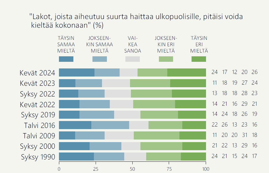 - Suomalaisista 41 prosenttia olisi valmiita kieltämään kokonaan lakot, joista aiheutuu suurta haittaa ulkopuolisille. 46 prosenttia ei anna tukeaan ehdotukselle. Suurta haittaa aiheuttavien lakkojen kieltämistä kannattavien osuus on kasvanut vuodessa 12 prosenttiyksikköä.