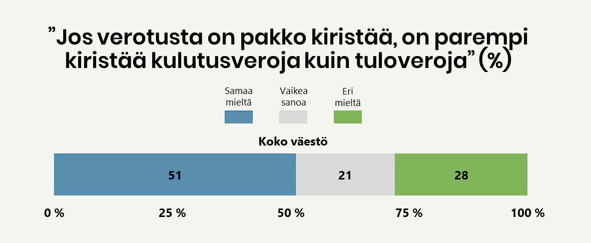 Suomalaisten enemmistö (51 %) katsoo, että jos verotusta on pakko kiristää, on parempi kiristää kulutusveroja kuin tuloveroja. Eri mieltä väitteen kanssa on reilu neljännes (28 %) kansalaisista, ja loput (21 %) eivät ota asiaan kantaa (Kuvio 1).