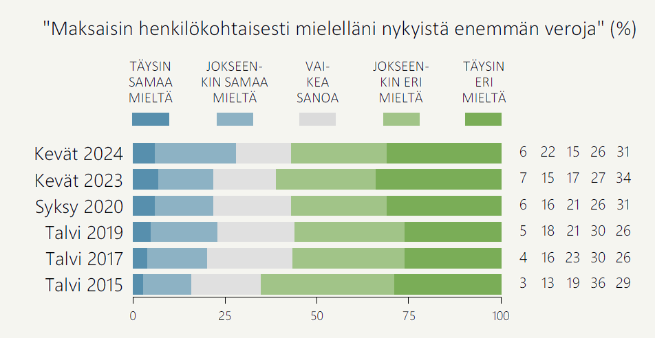 Iloisten veronmaksajien osuus jää edellisten mittausten tapaan alhaiseksi, joskin mielellään lisää veroja maksavien osuus on hieman kasvanut aikaisemmista mittauksista. Väitteen torjuvien enemmistö on kuitenkin pysytellyt samalla tasolla liki kymmenen vuoden mittaushistorian ajan.