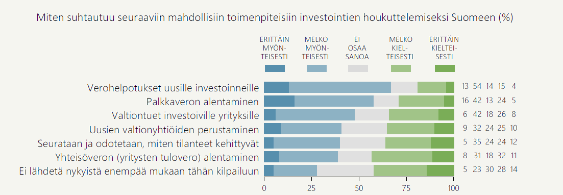 - Selvä enemmistö suomalaisista (67 %) suhtautuu myönteisesti verohelpotuksiin uusille investoinneille.