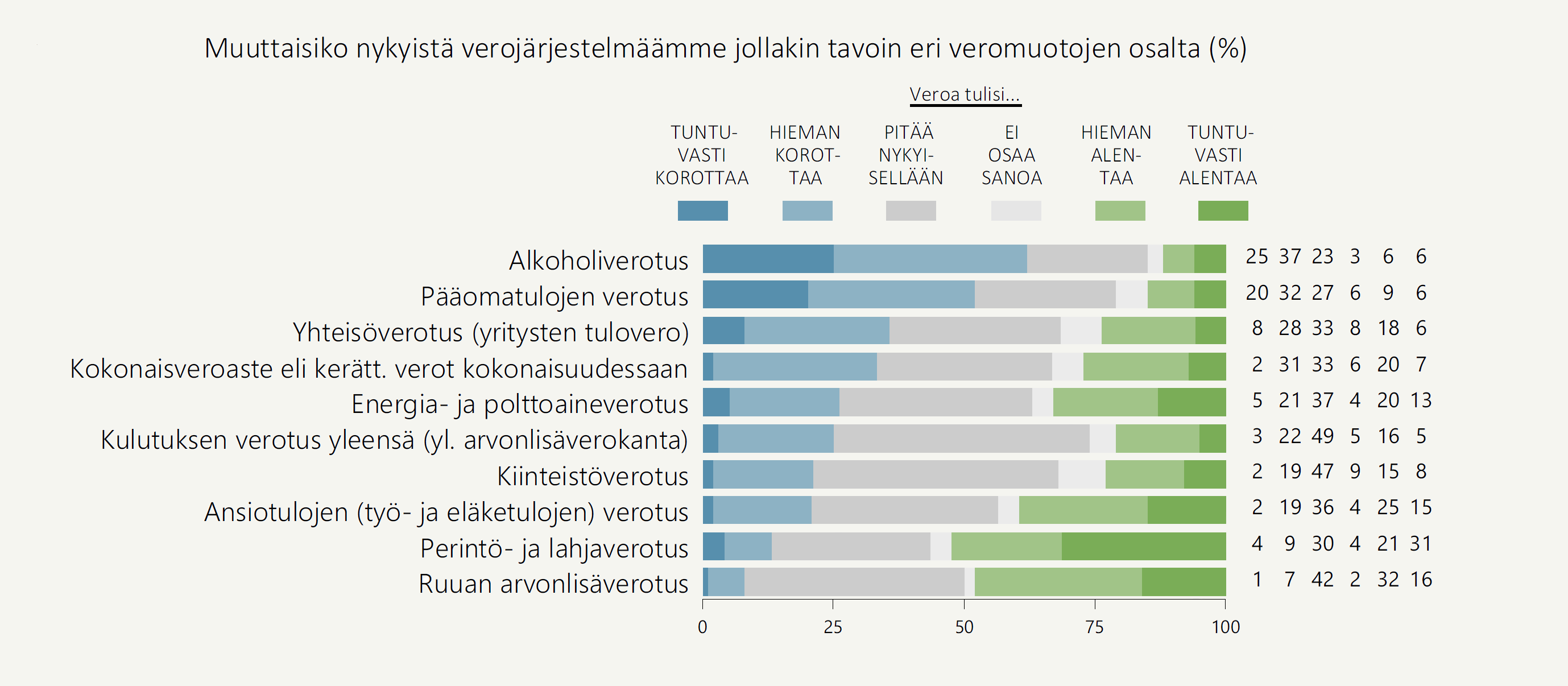 Tuloskokonaisuus kertoo, että suomalaiset suhtautuvat verotuksen muuttamiseen pääsääntöisesti melko varautuneesti, mutta poikkeuksiakin on.
