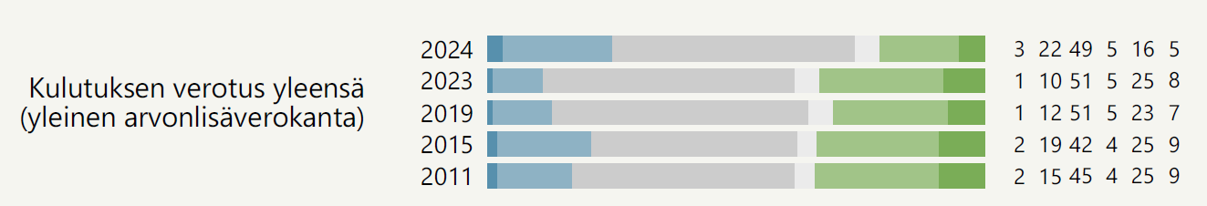 Missään väestöryhmässä enemmistö ei kallistu arvonlisäveron kiristämisen, mutta ei myöskään keventämisen kannalle. Valmius kiristää kulutuksen verotusta on eri puolueiden kannattajaryhmistä suurinta kokoomuksen äänestäjien (37 %) keskuudessa ja toiveet keventämisestä taas suurimpia perussuomalaisten äänestäjien (30 %) keskuudessa. Veronkevennysvaatimukset ovat kuitenkin vuoden aikana vähentyneet perussuomalaisten äänestäjien keskuudessa. [4] Muutos kielii siitä, että julkisen talouden ongelmien pahentuessa toiveet veronkevennyksistä hiipuvat ja osin myös valmius veronkiristyksiin kasvaa – mutta epämieluisia ne ovat edelleen etenkin oikeistopuolueiden äänestäjille.