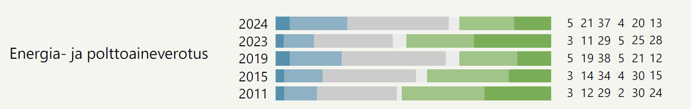 Kaksi kolmesta (66 %) perussuomalaisten äänestäjästä keventäisi energia- ja polttoaineverotusta vielä syksyllä 2023 tehtyjen polttoaineveron kevennysten jälkeenkin. Vain 11 prosenttia perussuomalaisten äänestäjistä kiristäsi energia- ja polttoaineverotusta, mutta vuosi sitten heitä ei ollut käytännössä lainkaan. Kokoomuksen äänestäjien keskuudessa yhtä suuri osuus (29 %) kiristäisi energia- ja polttoaineverotusta kuin keventäisi sitä (30 %). Vuodessa valmiudet kiristää näitä veroja on kokoomusäänestäjien joukossa kasvanut selvästi. Vihreiden (67 %) ja vasemmistoliiton (54 %) äänestäjien enemmistö kannattaa energia- ja polttoaineverotuksen kiristämistä (ks. Kuvioliite).