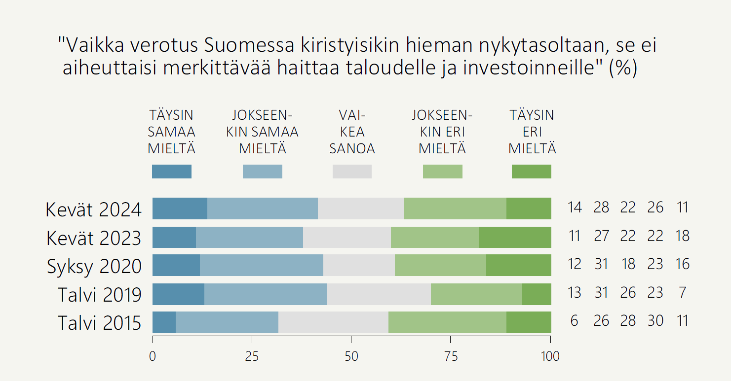 Suomalaisten näkemyksissä ei ole tapahtunut viime vuosina merkittävää muutosta. Näkemykset jakautuvat hallituksen ja opposition suurempien puolueiden äänestäjäryhmien kesken. Oppositiopuolueiden äänestäjien enemmistöt Liike Nyt -puoluetta lukuun ottamatta katsovat, ettei verotuksen maltillinen kiristyminen aiheuttaisi merkittävää haittaa taloudelle ja investoinneille. Sen sijaan huoli verotuksen kiristymisen vaikutuksista talouteen ja investointeihin paikantuu hallituksessa kokoomuksen ja perussuomalaisten äänestäjiin, joiden enemmistöt ovat veronkiristysten aiheuttamien haittojen vähäisyydestä eri mieltä. RKP:n ja kristillisdemokraattien äänestäjien näkemykset jakautuvat, ja varsin moni jättää ottamatta kantaa kysymykseen (ks. Kuvioliite).