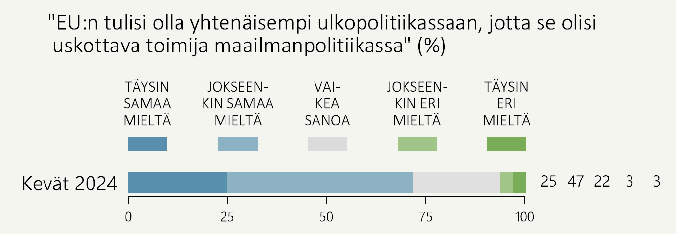 Suomalaiset seuraavat Euroopan ja maailman tapahtumia tarkasti. Tästä kielii osaltaan myös se, että kansalaiset tunnistavat EU:n ulko- ja turvallisuuspolitiikan päätöksentekoon liittyvän ongelman. Lähes kolme neljästä (72 %) on sitä mieltä, että EU:n tulisi olla yhtenäisempi ulkopolitiikassaan, jotta se olisi uskottava toimija maailmanpolitiikassa. Vain kuusi prosenttia ei näe tarvetta yhtenäisemmälle EU:n ulkopolitiikalle.