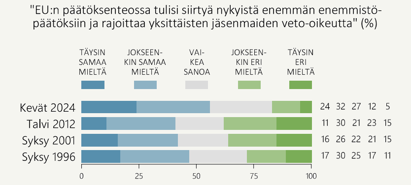 - Aiempaa selvästi suurempi osa (56 %) on nyt sitä mieltä, että EU:n päätöksenteossa tulisi siirtyä nykyistä enemmän enemmistöpäätöksiin ja rajoittaa yksittäisten jäsenmaiden veto-oikeutta.