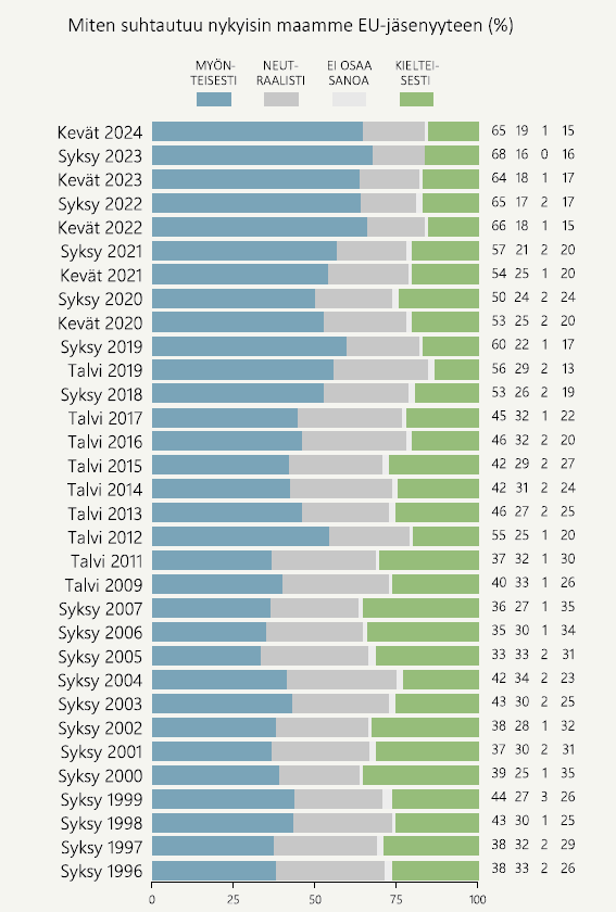 EU-asenteet ovat liikkuneet keväästä 2022 alkaen 66 prosentin keskiarvon molemmin puolin, kun ennen Venäjän hyökkäystä EU-myönteisyys pysyi käytännössä koko Suomen EU-jäsenyyden historian ajan alle 60-prosentin tasolla ja ennen eurokriisiä pääsääntöisesti alle 40 prosentin tasolla.