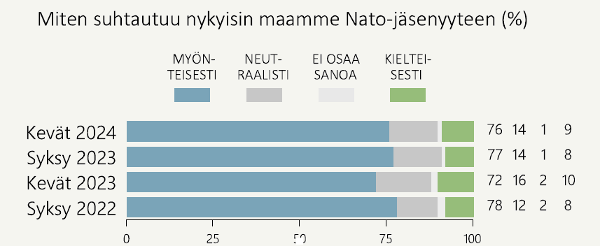 EU:n puolustusta selkeämpi kysymys suomalaisille suhtautuminen maamme Nato-jäsenyyteen, Myönteinen suhtautuminen siihen on pysynyt hyvin korkealla tasolla siitä lähtien, kun päätös Nato-jäsenyydestä tehtiin.