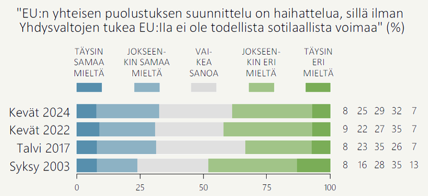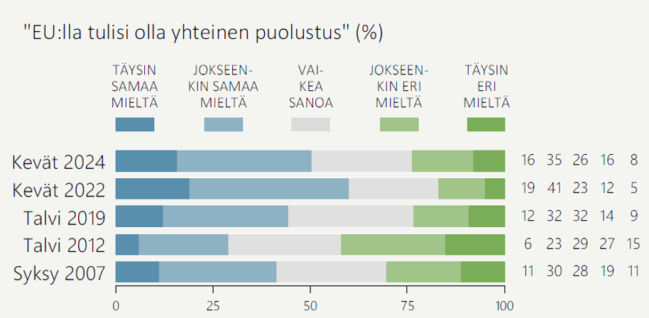 Toisaalta toive yhteisestä EU-puolustuksesta on nyt hieman vahvempi kuin ennen sotaa tehdyissä mittauksissa, vaikka Nato-jäsenyys takaa Suomelle sitovat sotilaalliset turvatakuut sekä maailman sotilaallisesti vahvimman suurvallan, Yhdysvaltojen, tuen hyökkäyksen sattuessa. ”Sekä, että” -asennoituminen kertoo, että moni haluaa sotilaalliselle turvallisuudelle mahdollisimman monta lisävarmistusta.