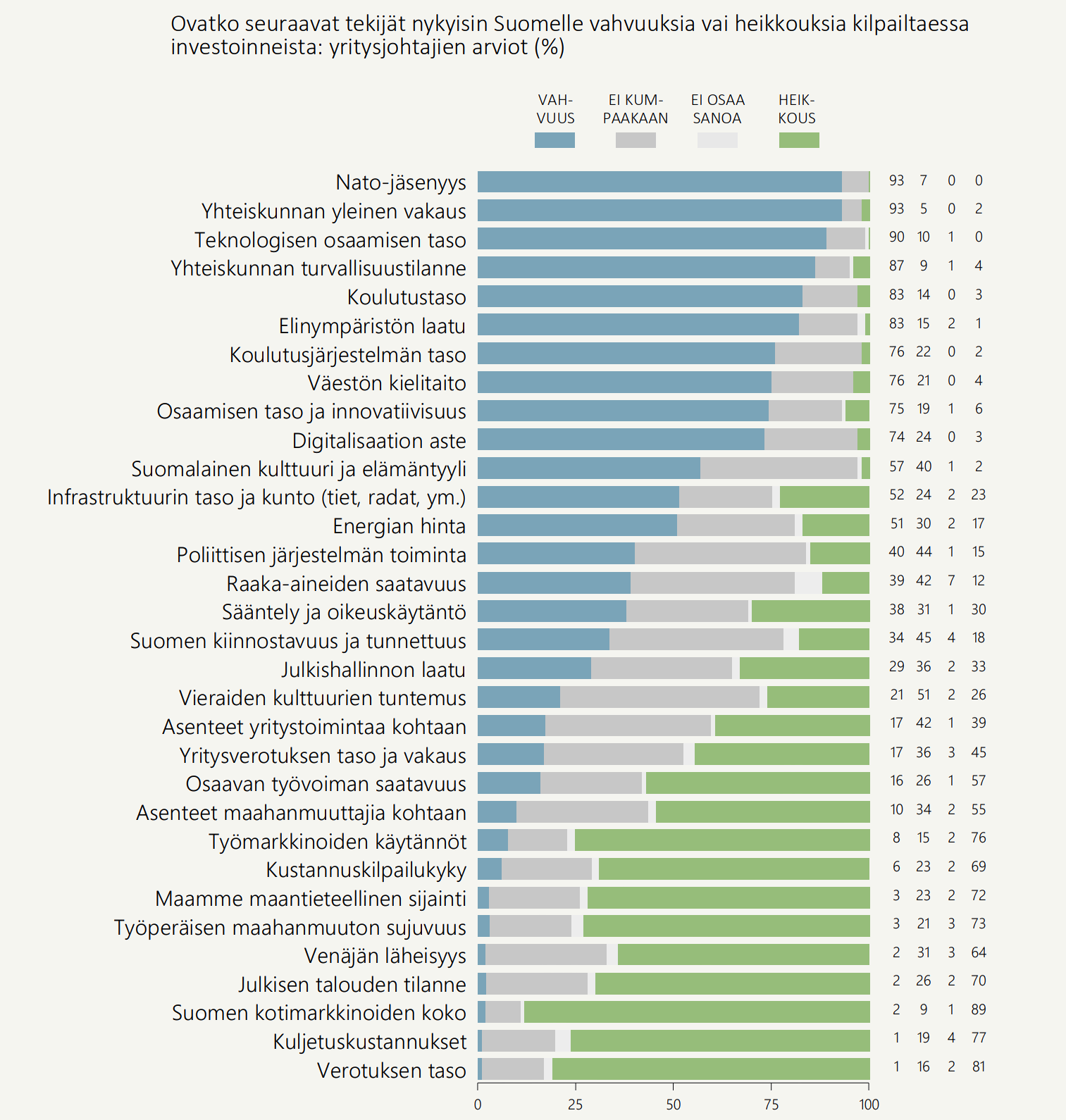 Selkeinä Suomen vahvuuksina investointien näkökulmasta yritysjohtajat pitävät Nato-jäsenyyttä (93 %), yhteiskunnan yleistä vakautta (93 %), teknologista osaamistasoa (90 %), yhteiskunnan turvallisuustilannetta (87 %) ja koulutustasoa (83 %).