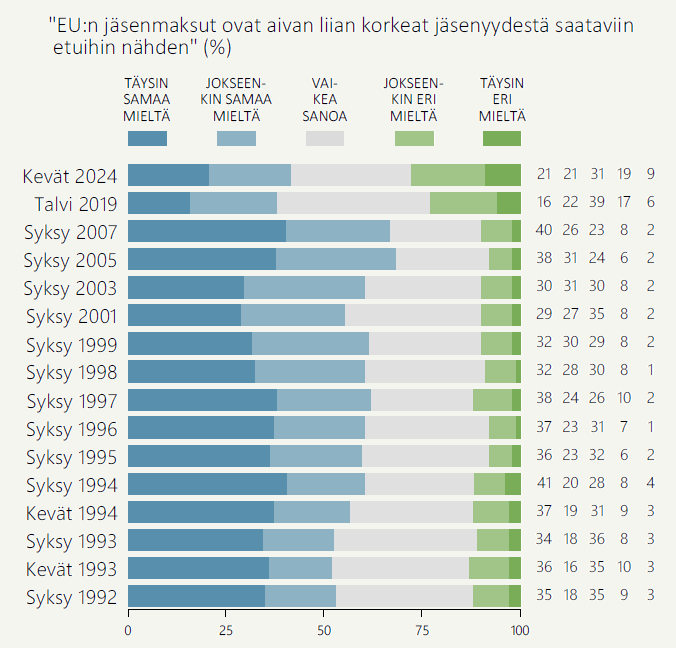 Laaja epävarmojen osuus voi kieliä siitä, että monet suomalaiset ymmärtävät EU:n tarvitsevan lisää rahoitusta etenkin puolustuksen ja laajentumisen suhteen. Toisaalta lisämaksuhalukkuus on nihkeää, kun suomalaisilla on kannateltavanaan myös oma velkainen julkinen taloutensa. On mahdollista, että moni suomalainen haluaisi lisärahoituksen sijaan vahvistaa Euroopan asemaa maailmassa suuntaamalla nykyisiä resursseja toisin.