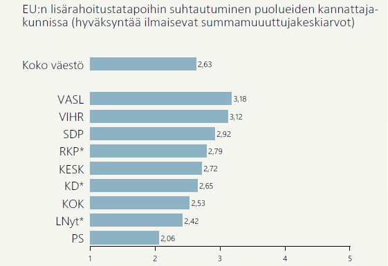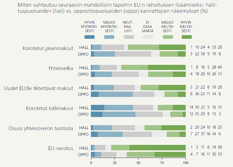 Puoluekohtaiset erot suhtautumisessa EU:n uusiin varoihin heijastavat näkemyseroja suhtautumisessa Suomen verotukseen. Oikeistopuolueet ja niiden äänestäjät suhtautuvat kaikkiin veroihin ja maksuihin vasemmistopuolueita kielteisemmin. Kriittisimmin kotimaisiin veroihin suhtautuvat perussuomalaisten äänestäjät, jotka ovat muita äänestäjäryhmiä kriittisempiä myös mahdollisia EU:n uusia rahoituskeinoja kohtaan. [11]