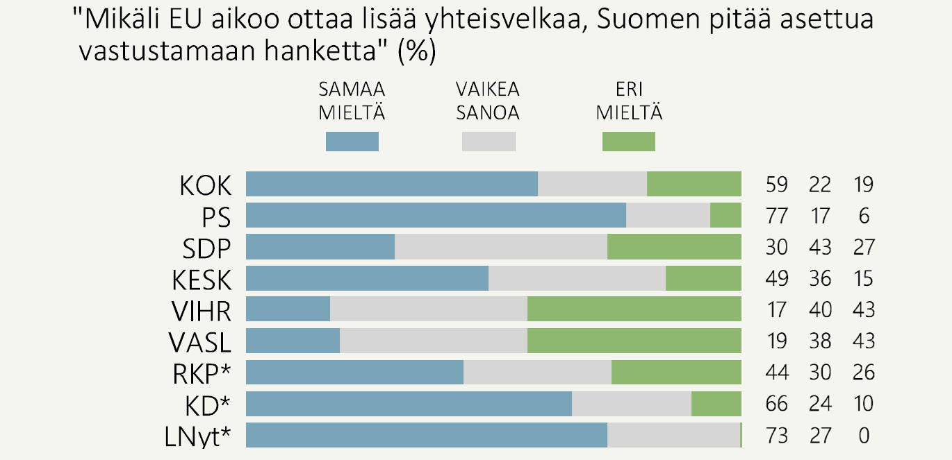 Yhteisvelka ei saa yhdenkään puolueen äänestäjien enemmistöä taakseen. Vain vasemmistoliiton kannattajissa on enemmän yhteisvelkaan myönteisesti kuin kielteisesti suhtautuvia, ja enemmistö vastustaa sitä kaikissa muissa paitsi vasemmistopuolueiden ja vihreiden kannattajaryhmissä.