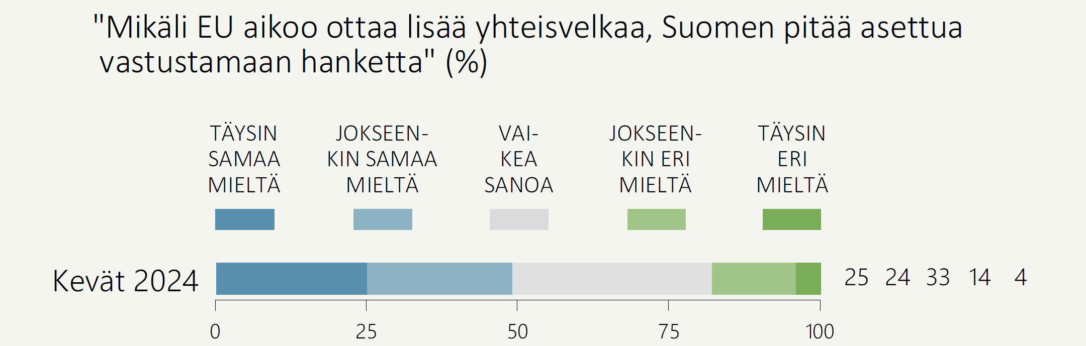 Monille suomalaisille uuden yhteisvelan ottaminen olisi niin epätoivottavaa, että he toivovat Suomen asettuvan asiassa poikkiteloin. Puolet suomalaisista (49 %) katsoo, että Suomen pitää asettua vastustamaan yhteisvelkaa, mikäli EU aikoo ottaa sitä lisää. Vajaa viidennes (18 %) on väittämän kanssa eri mieltä eli ei asettuisi vastustamaan yhteisvelkaa. Kolmannes (33 %) jää asiassa vaille kantaa (Kuvio 4).