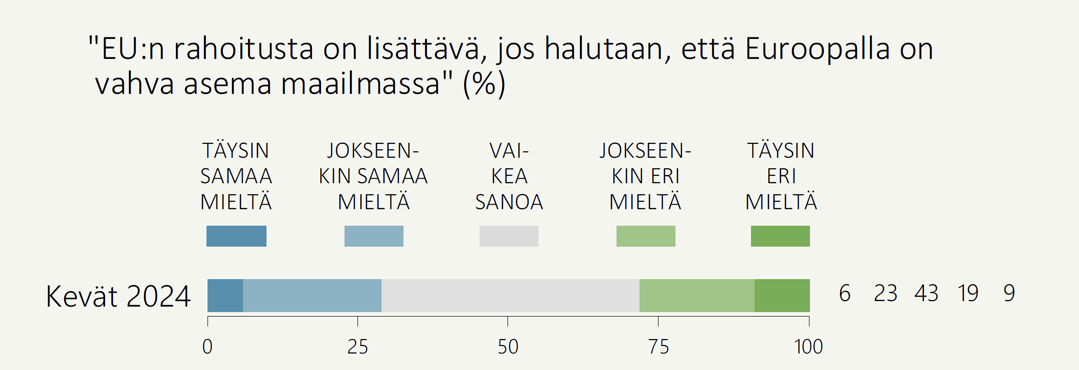 Kysymys EU:n rahoituksen kasvattamisesta Euroopan vahvan aseman turvaamiseksi on suomalaisille vaikea. Kolme kymmenestä suomalaisesta (29 %) katsoo, että EU:n rahoitusta on lisättävä, jos halutaan, että Euroopalla on vahva asema maailmassa. Yhtä moni (28 %) on asiasta toista mieltä. Hyvin suuri osuus (43 %) ei ota asiaan kantaa (Kuvio 1).