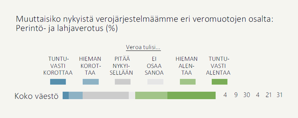 Yli puolet (52 %) suomalaisista alentaisi perintöveroa, kolmannes (31 %) jopa tuntuvasti. Vain 13 prosenttia suomalaisista kiristäisi perintöveroa (Kuvio 1).