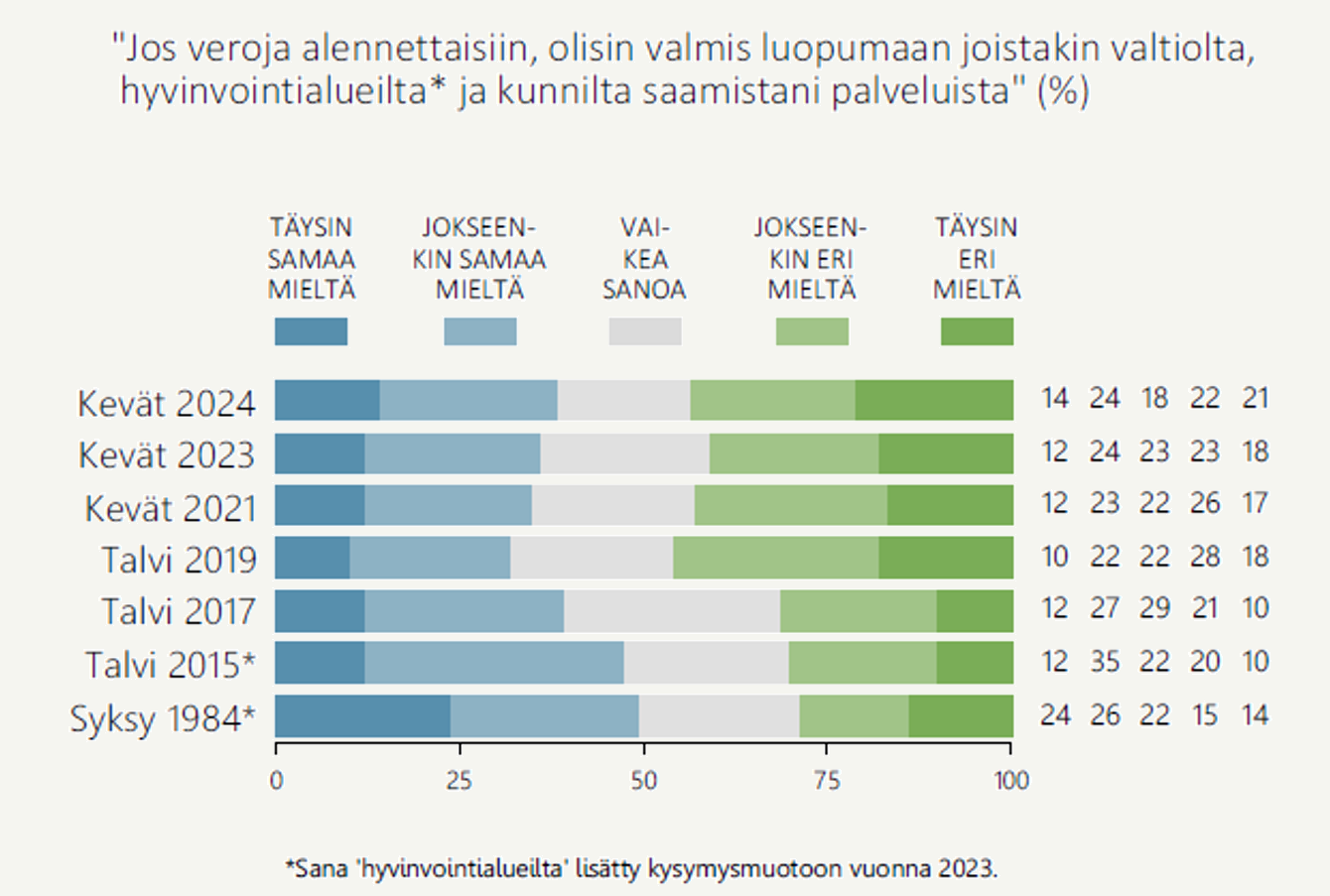 Julkisten menojen paisuessa moni kyseenalaistaa sen, onko kaikkien palveluiden tuottamista tarpeen rahoittaa julkisista varoista. Suomalaisista 38 prosenttia olisi valmis luopumaan joistakin valtiolta, hyvinvointialueilta ja kunnilta saamistaan palveluista, jos veroja alennettaisiin (Kuvio 4). Hieman suurempi osa (43 %) ei olisi valmis luopumaan mistään saamistaan palveluista, vaikka veroja alennettaisiin.
