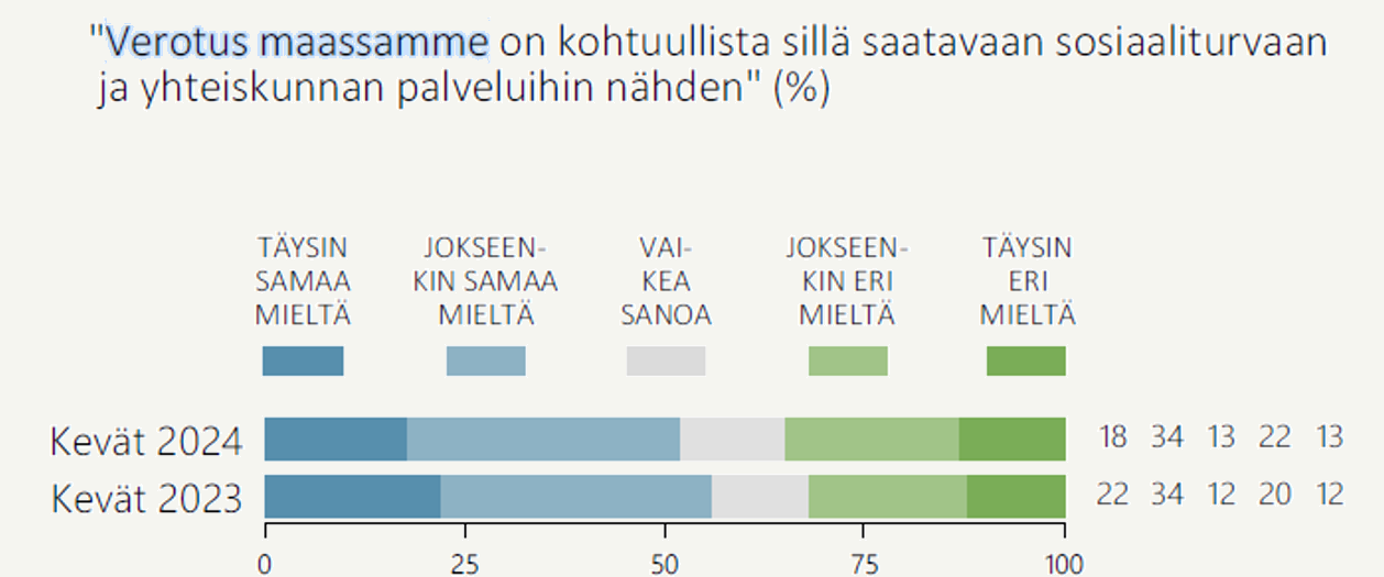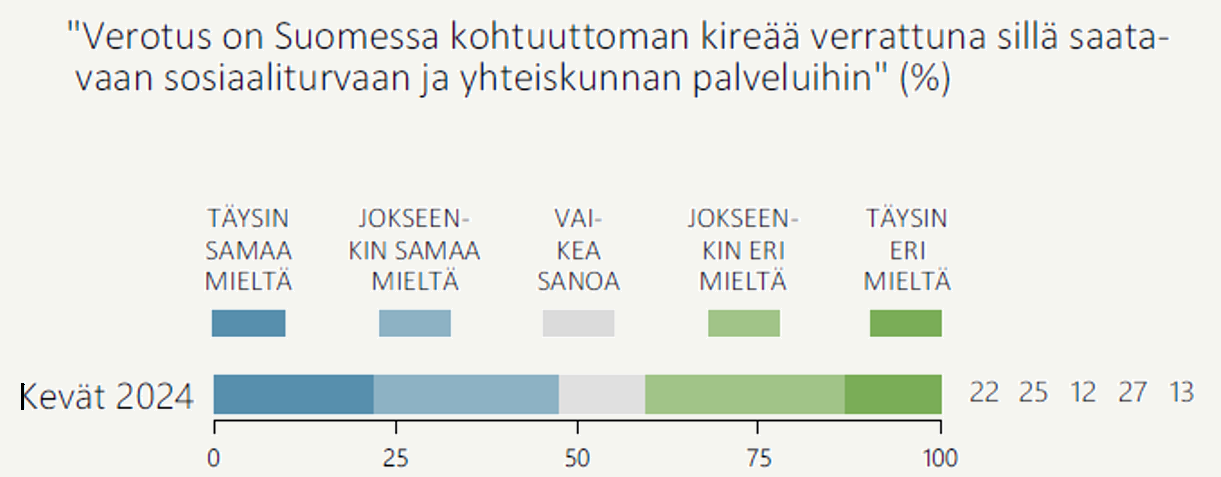 - Lähes puolet (47 %) katsoo, että verotus on Suomessa kohtuuttoman kireää verrattuna sillä saatavaan sosiaaliturvaan ja yhteiskunnan palveluihin. Eri mieltä on 40 prosenttia.