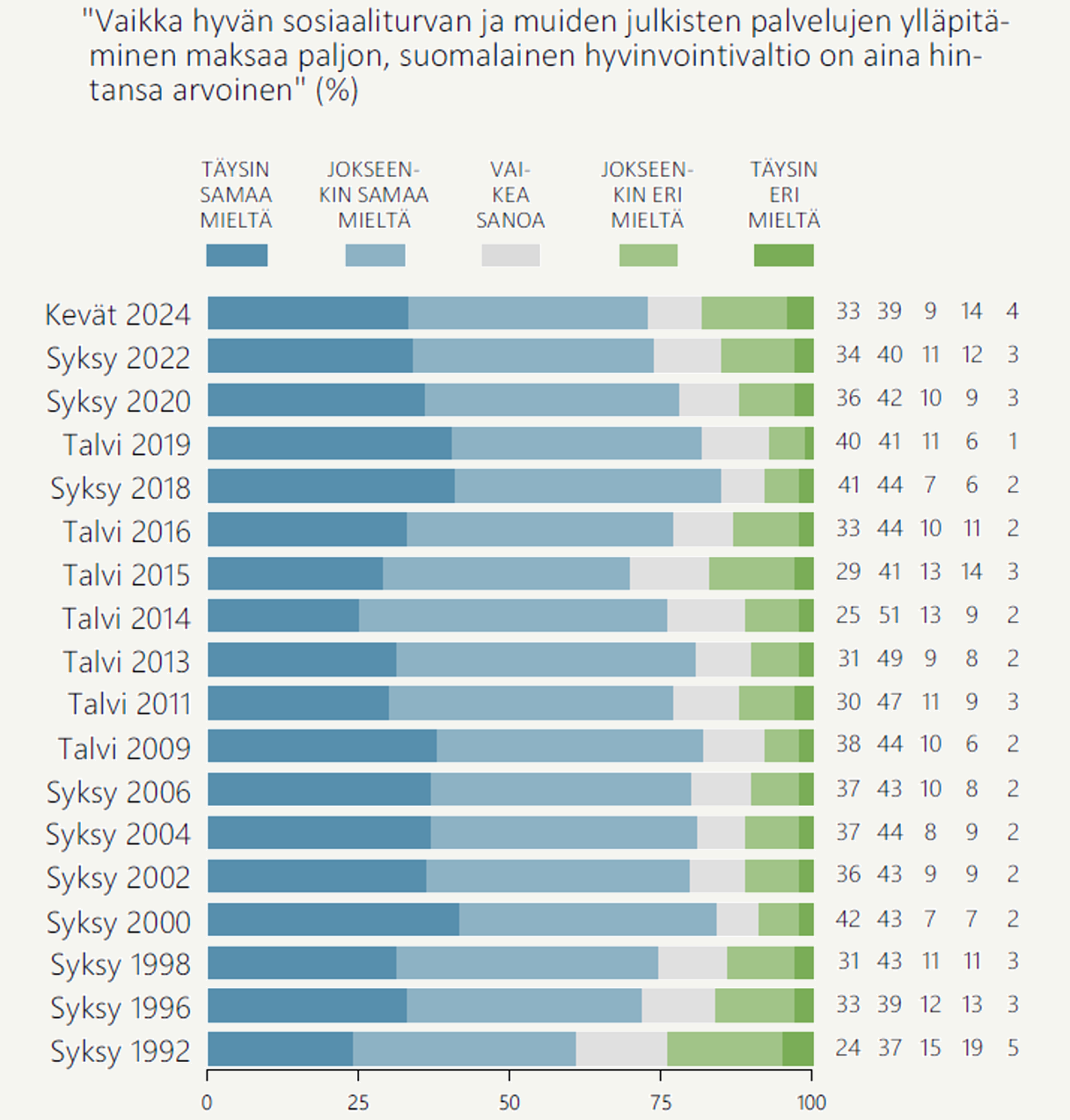Suomalaisten suuri enemmistö (72 %) pitää suomalaista hyvinvointivaltiota aina hintansa arvoisena, vaikka hyvän sosiaaliturvan ja muiden julkisten palvelujen ylläpitäminen maksaa paljon (Kuvio 1). Viidennes (18 %) on eri mieltä hyvinvointivaltion hintalapun hyväksyttävyydestä. Suomalaisten suhtautuminen hyvinvointivaltion aiheuttamiin kustannuksiin on perinteisesti ollut hyvin ymmärtäväistä, mutta asenteet ovat jossain määrin vaihdelleet julkisen talouden tilanteen mukaan.