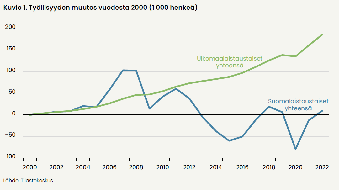 Maahanmuutto on paikannut ongelmaa. Suomen työllisyyden kehitys on erityisesti 2000-luvulla ollut maahanmuuton varassa. Ulkomaalaistaustaisten työllisten määrä on kasvanut lähes 200 000:lla vuosien 2000–2022 välillä (Kuvio 1).