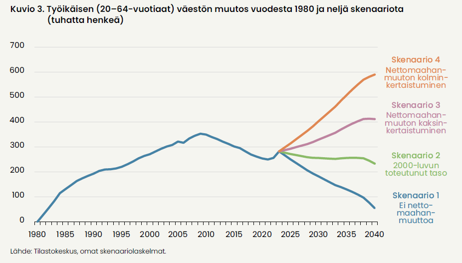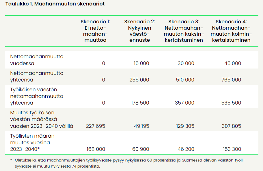 Maahanmuutto nousee pysyvästi uudelle ennätystasolle. Nettomaahanmuutto kolminkertaistuu 2000-luvun tasoon nähden. Suomeen muuttaa vuosittain noin 60 000 maahanmuuttajaa, ja Suomesta lähtee vuosittain 15 000 ihmistä. Koska tyypillisesti 70 prosenttia maahanmuuttajista on työikäisiä, Suomeen tulee 31 500 työikäistä vuosittain lisää. Tämä maahanmuuton taso nostaa työikäisen väestön määrän voimakkaaseen kasvuun. Työikäisen väestön määrä kasvaa 307 000 hengellä vuoteen 2040 mennessä.