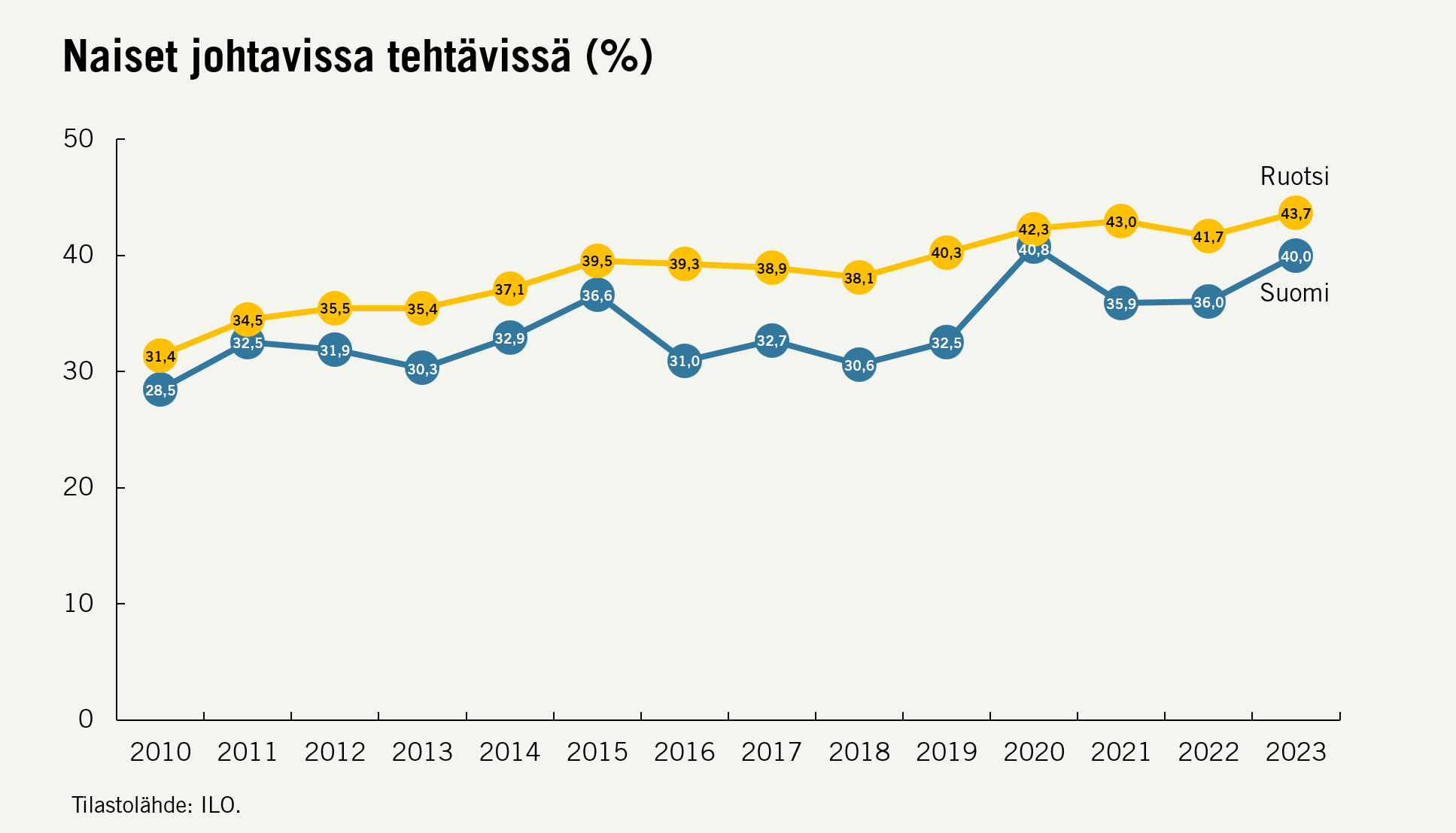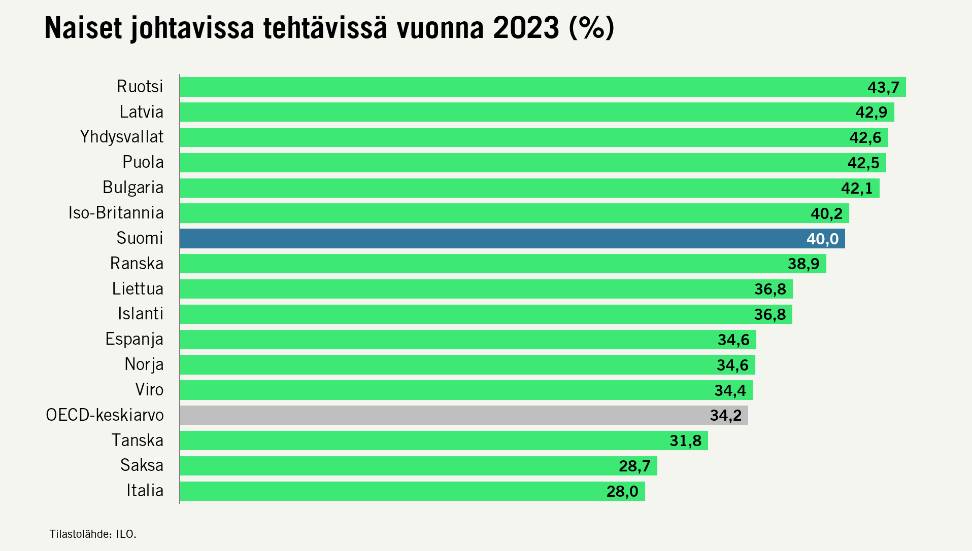 Suomi on saavuttanut tasa-arvon alarajana pidetyn 40 prosentin rajan naisjohtajien osuudessa. Vuonna 2022 vastaava luku oli 36,0 prosenttia. Yhä useampi nainen on siis noussut johtotehtäviin.