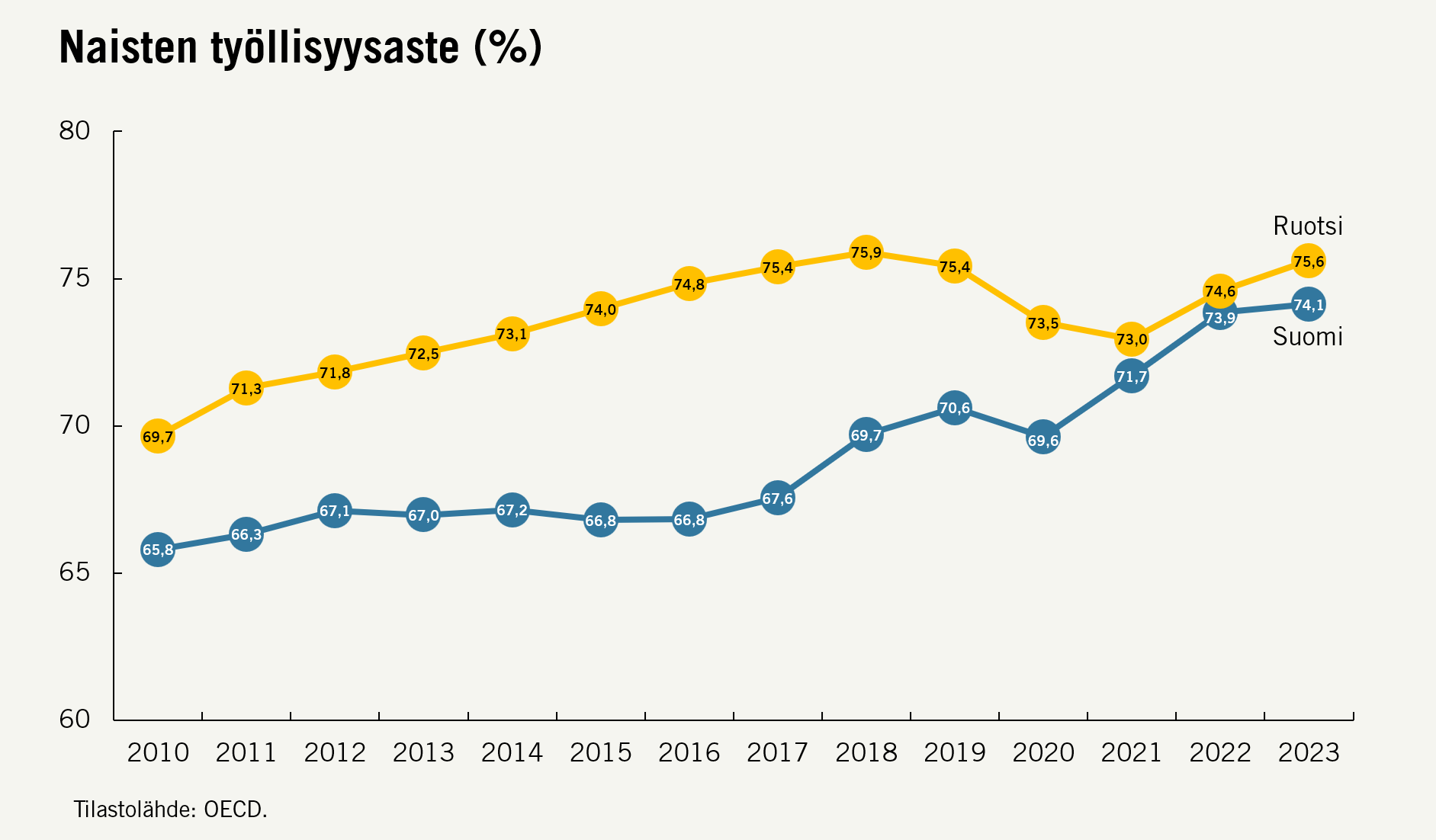 Koronavuosina naisten työllisyysaste aleni hieman sekä Suomessa että Ruotsissa, mutta sen jälkeen naisten työllisyysaste kääntyi Ruotsia ripeämmin kasvavalle uralle. Molemmissa maissa naisten työllisyysaste on verraten korkea.